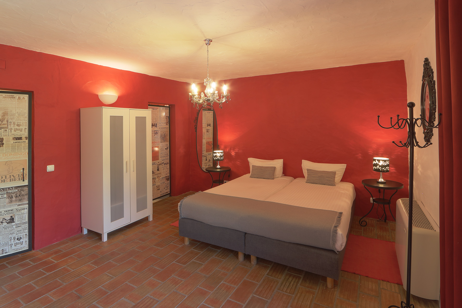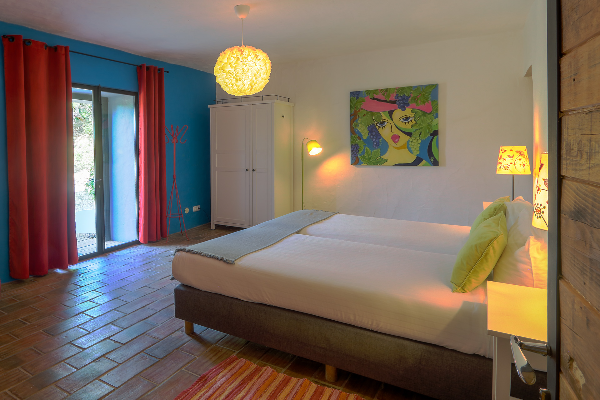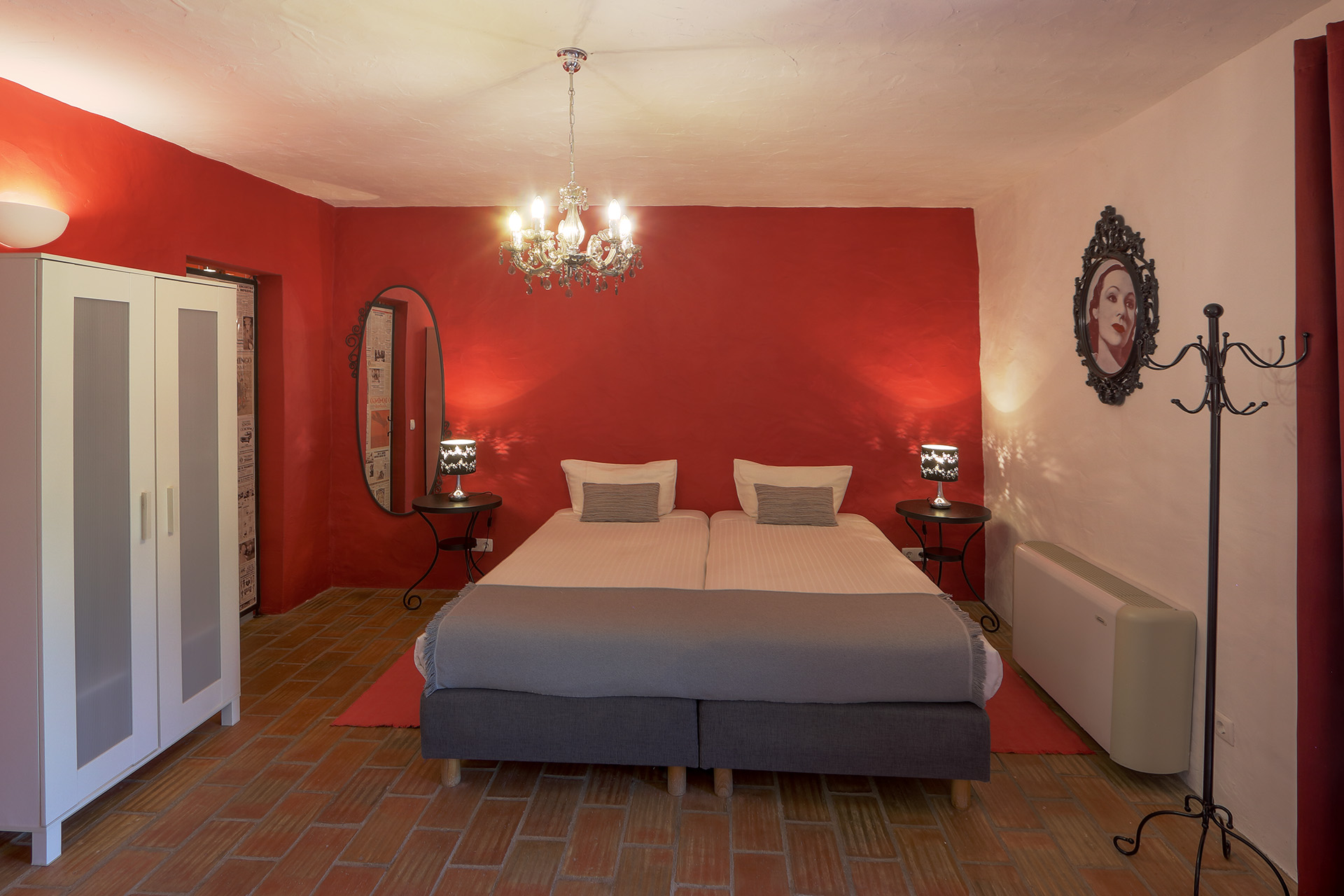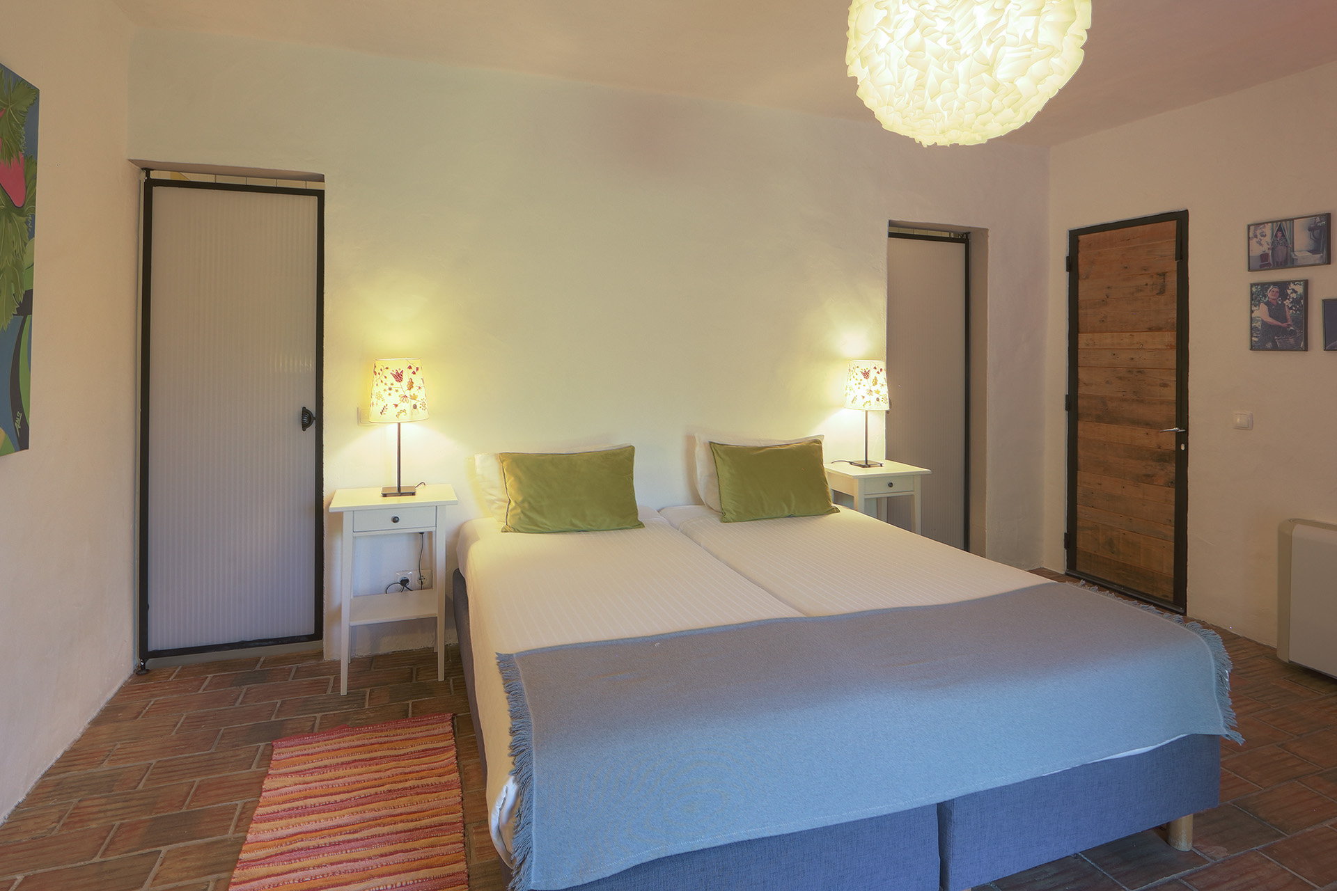The romantic Bohemian room has a double Queen Size bed. This room can be connected as an extra bedroom to the Vintage apartment. It has a French balcony with beautiful views over the valley and swimming pool. If you like cooking, you can use the communal kitchen and BBQ in the garden. There is also a communal seating and dining area with an honesty bar and satellite TV.